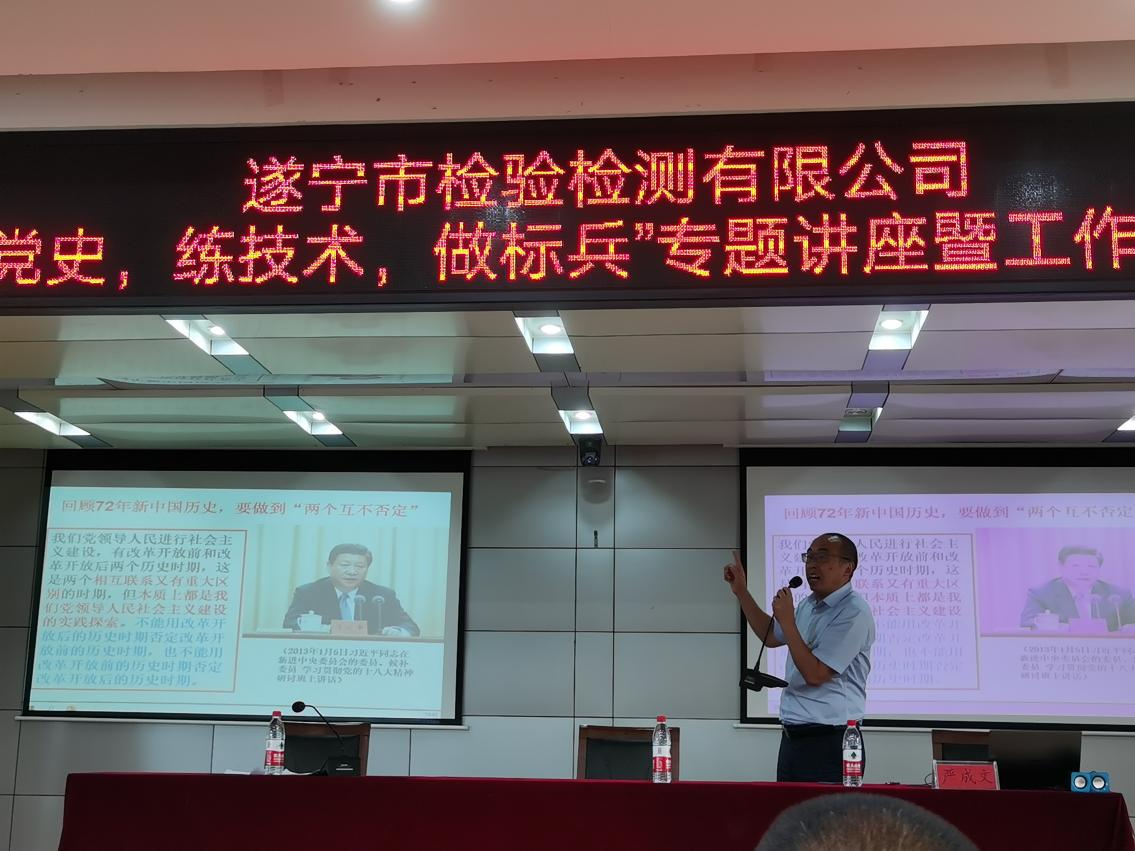 ? ? 會議邀請中共遂寧市委黨校信息技術(shù)中心主任、市委黨史學(xué)習(xí)教育宣講團第十二分團成員嚴成文為全體員工授課。他從學(xué)出信念堅定、忠誠擔(dān)當(dāng),學(xué)出無私奉獻、顧全大局,學(xué)出辯證思維、客觀理性,學(xué)出改革勇氣、創(chuàng)新精神,學(xué)出為民情懷、群眾路線,學(xué)出勤奮學(xué)習(xí)、韜光養(yǎng)晦,學(xué)出紀律嚴明、步調(diào)一致等內(nèi)容出發(fā),以激情地演講、組織觀看歷史紀錄片、現(xiàn)場互動等方式,生動、形象地講述了黨的百年歷程和成長啟示,告訴大家要不忘初心、牢記使命,以習(xí)近平總書記在慶祝中國共產(chǎn)黨成立100周年大會上的重要講話精神為指導(dǎo),增強“四個意識”,堅定“四個自信”,做到“兩個維護”。遂檢公司作為一支年輕的隊伍,要深化對國有企業(yè)的認識,增強發(fā)展信心,做到對企業(yè)和職業(yè)忠誠;要面對困難和挫折,敢于負責(zé),敢于作為;要站在人民立場,踐行好公司“精準(zhǔn)、公正、高效”理念,干好檢驗檢測工作。